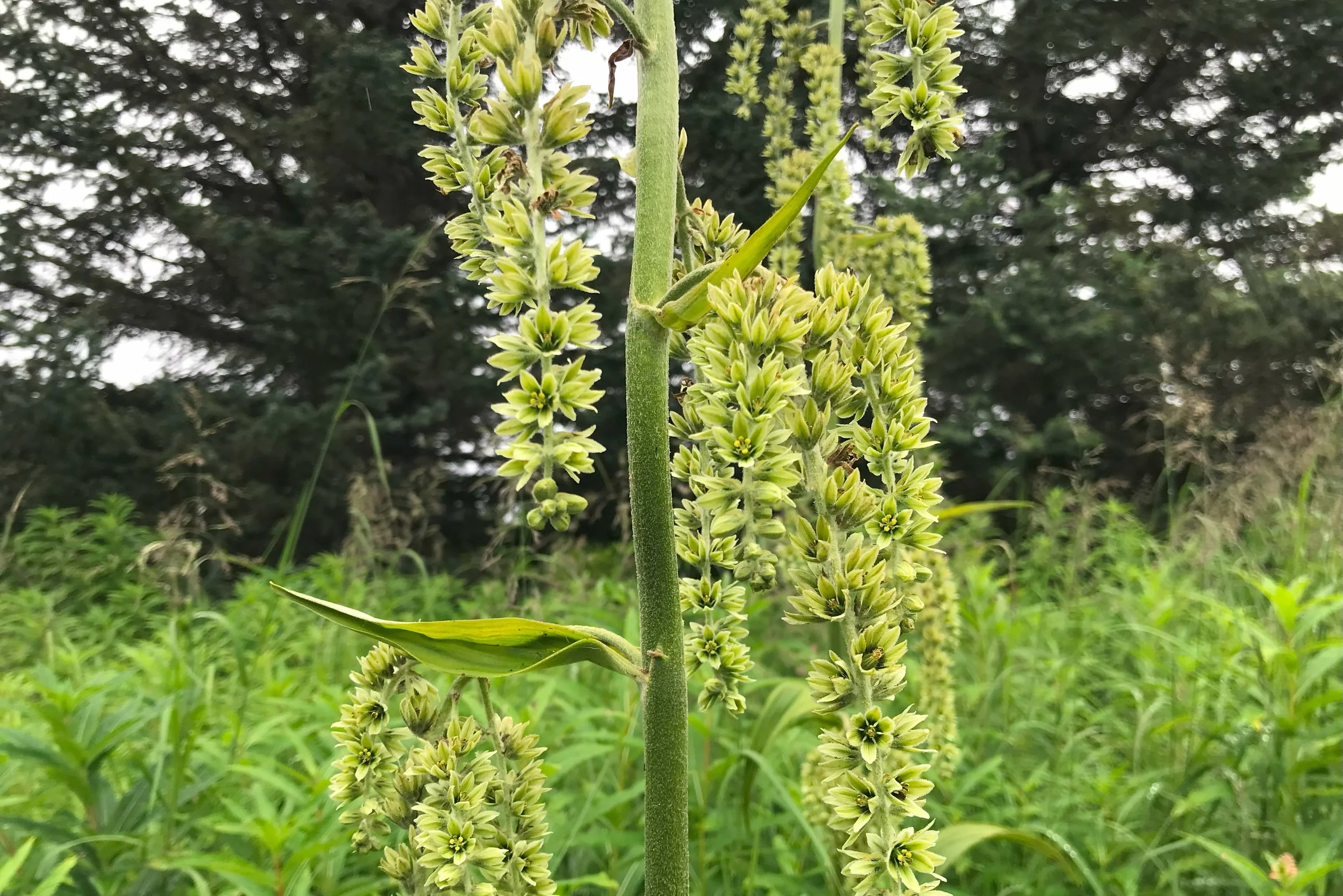False hellebore (Veratrum viride) is found in meadows and along streams. The large blue-green leaves are distinctively veined, and have a whitish cast below, superficially resembling watermelon berry. The greenish-yellow flowers are born on a spike in drooping clusters. It is in the family Liliaceae (lily family).