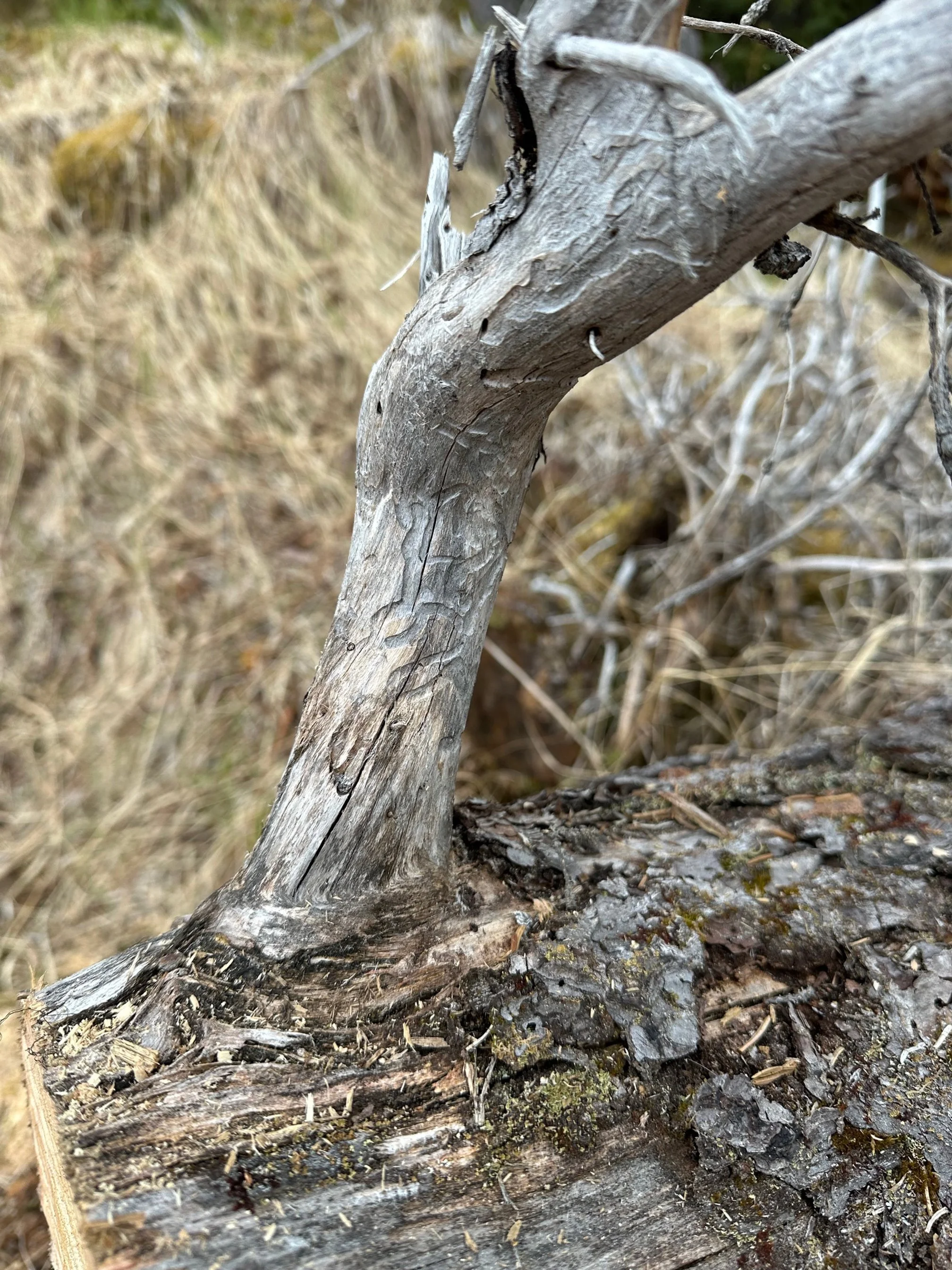 Picture shows beetle tracks throughout the woody part of the tree below where the bark once covered.